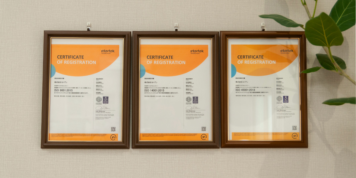 電気工事のプロフェッショナルとして、国際基準に基づく体制を整えています。国際基準の3つのISO認証を取得することで、より高い信頼と安心をお届けいたします。